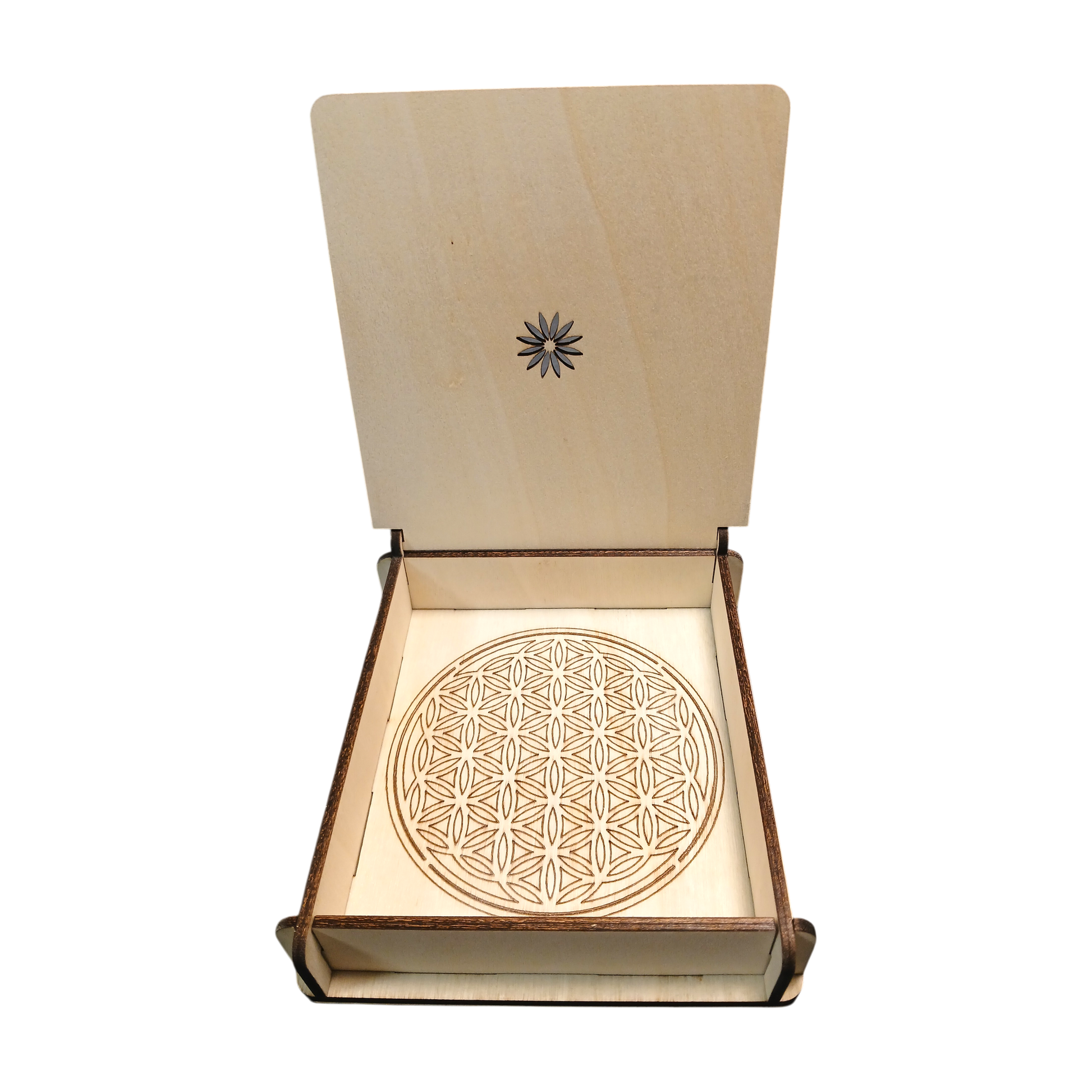 Fabriquée artisanalement en bois, découpée et gravée avec précision au laser, cette boîte est décorée d’un mandala et d'un soleil, des symboles de lumière, de vitalité et d’énergie positive, ils invitent à la joie et à l’expansion. À l’intérieur, la Fleur de Vie, symbole d’harmonie et d’équilibre, accompagne tes objets avec une énergie douce et apaisante.